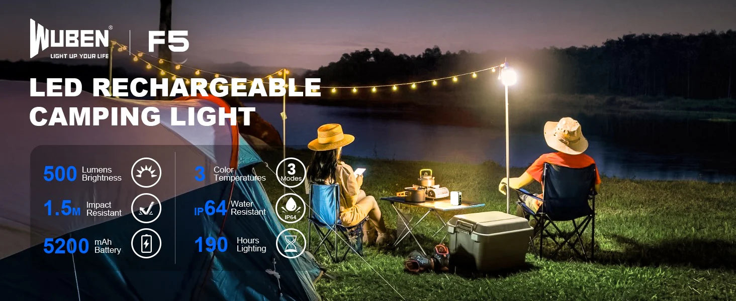 Leistungsstärker als erwartet: Eingebauter 5200mAh-Akku, max. 500 Lumen, längste Laufzeit bis zu 190h (niedrig). Aus langlebigem ABS, einfaches Design, IP64-wasserdicht und 1m sturzfest — perfekt für viele Gelegenheiten.